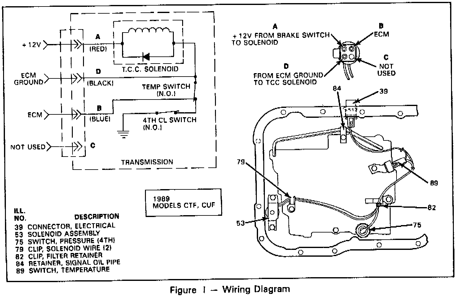 Beginning with the 1989 model year the CTF and CUF 200-4R models were built with a new solenoid assembly (refer to figure 1). The new solenoid assembly no longer uses the 4-3 pulse switch. The new solenoid assembly, listed under "Service Parts Information", should be used when servicing any 1989 CTF or CUF models.