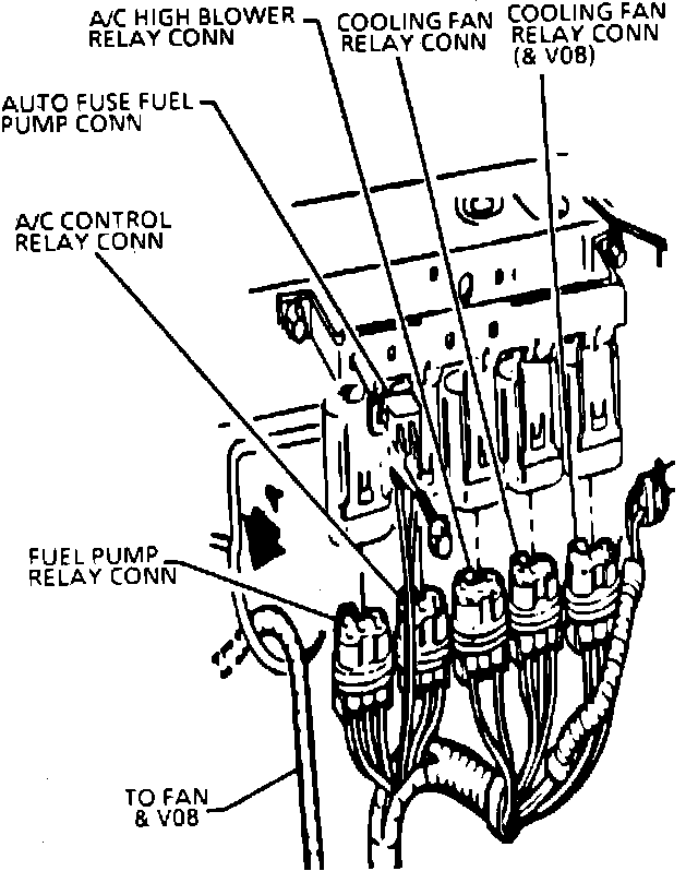 NOTE: Other than checking for loose connections the only service on the fuel pump relay is replacement. The fuel pump relay is located in the engine compartment, attached to the multi-use bracket mounted on the right hand side of the radiator support.