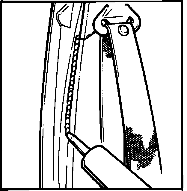 4. Inject black silicone rubber (3M # 08662, American/Dominion Sure Seal # CDB or LZB, Permatex # 16C or 16B, or equivalent) between the inboard edge of the run channel and the seat belt attaching bracket until slight squeeze out is seen (See Figure 2).
