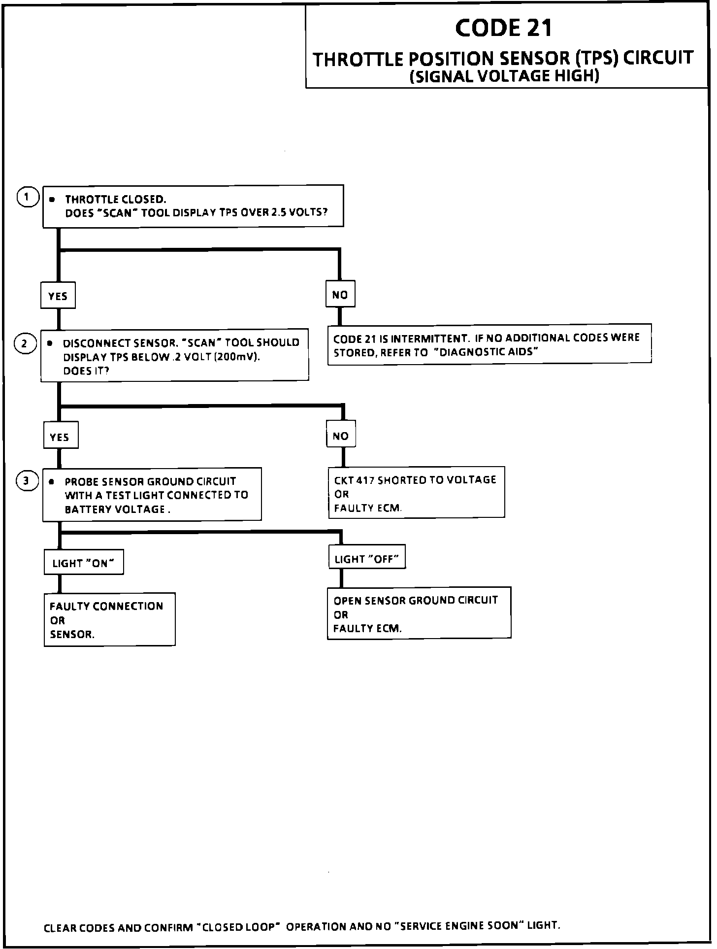 ^ Codes 15, 21 and 66 stored at the same time could be the result of an open CKT 452. "Scan" TPS while depressing accelerator pedal with engine stopped and ignition "ON". Display should vary from below 500 mV (.5 volts) when throttle is closed, to over 4500 mV (4.5 volts) when throttle is held wide open.
