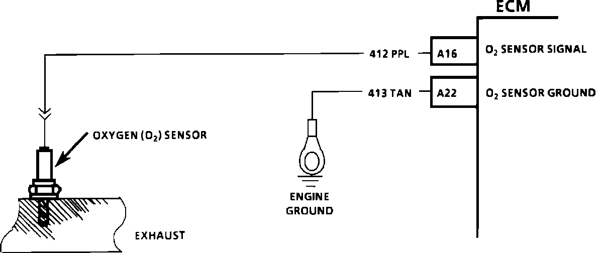 The ECM supplies a voltage of about 0.45 volt between terminals "A16" and "A22". (If measured with a 10 megohm digital voltmeter, this may read as low as 0.32 volt.) The 02 sensor varies the voltage within a range of about 1 volt if the exhaust is rich, down through about 0.10 volt if exhaust is lean.