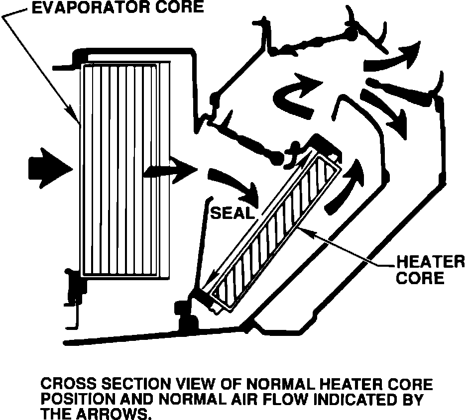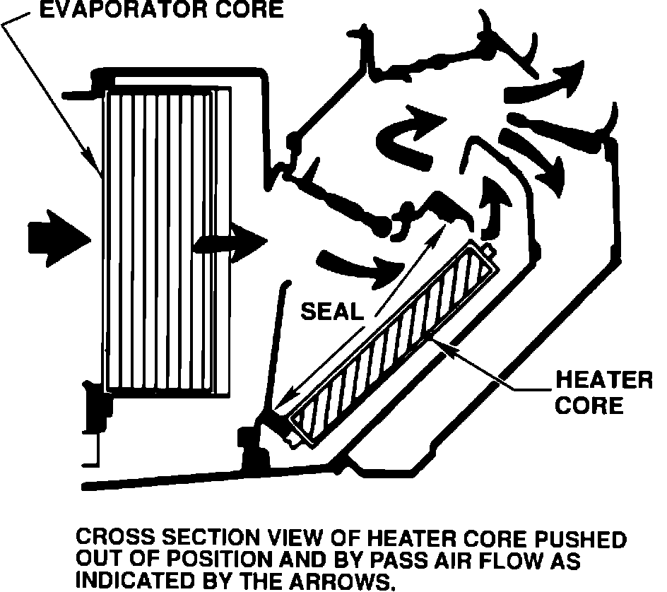 If the heater system is operating properly and engine temperature is in the operating range, the cause of the problem may be that the heater core has been pushed out of its proper position, see Figures 1 and 2. This misposition of the heater core allows the outside cold air to by-pass the core and enter the vehicle through the heater outlets.