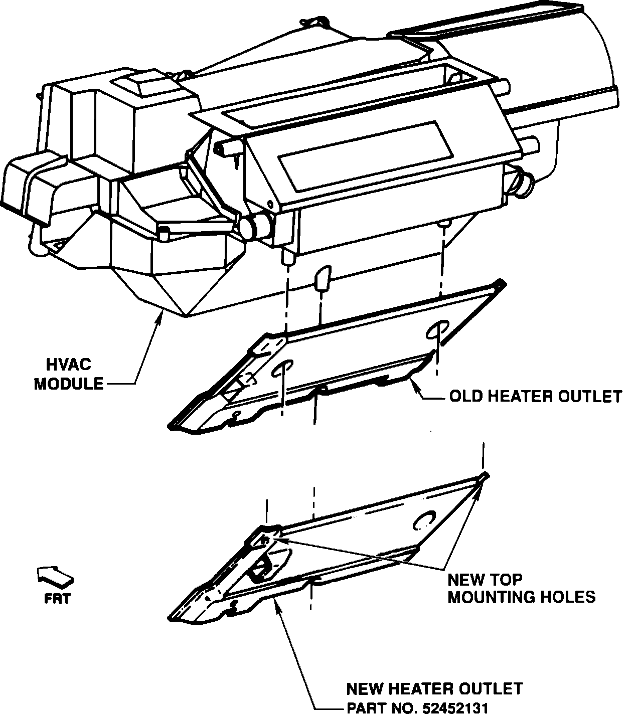 To address this condition use the service manual procedure on the removal of the heater core cover. If the core is out of position as shown in Figure 2, reposition the core and install the heater core cover. If the HVAC module has the old heater outlet, as shown in Figure 3, it would be advisable to install the new heater outlet as specified in Dealer Technical Bulletin 90-T-58.