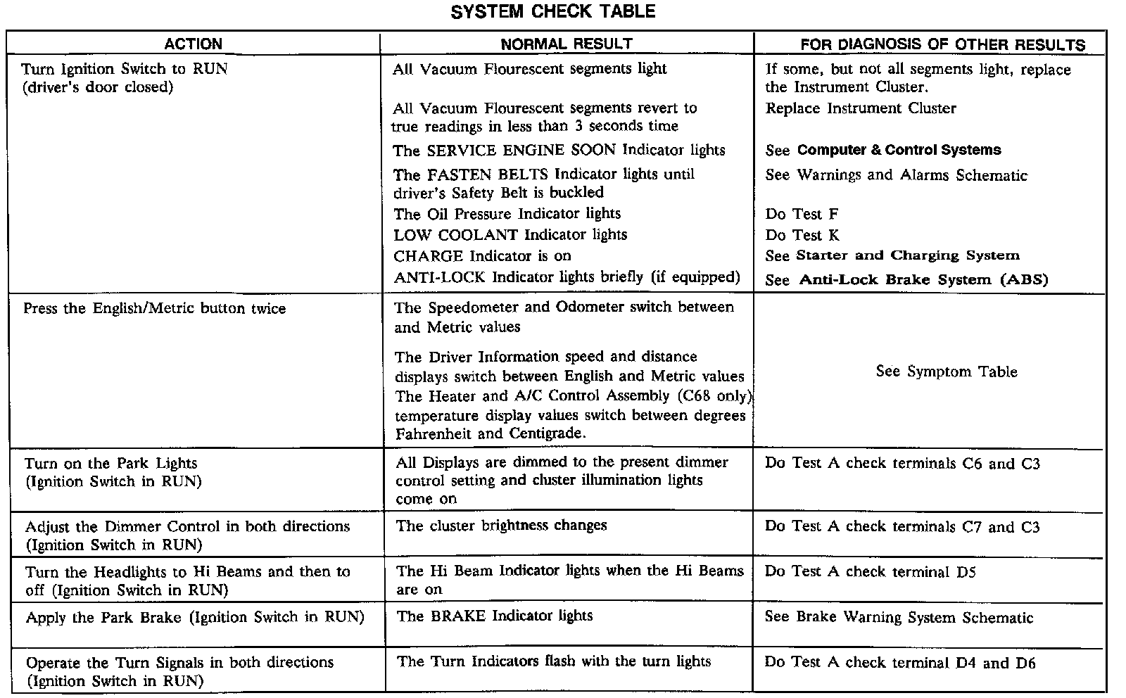 Use the System Check Table as a guide to normal operation. Refer to the diagnosis given if other results occur.