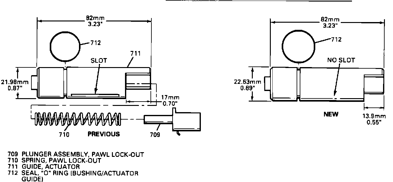 - Actuator guide is now wider by 0.65 mm (0.0261 for the increased thickness of the parking lock actuator assembly. The pawl lock-out plunger assembly and spring are eliminated. Now, there is no need for a slot for the plunger to ride in; therefore, the slot has been eliminated. The "O" ring (bushing/actuator guide) seal is now larger to accommodate the increased thickness of the actuator guide. (Figure 1)