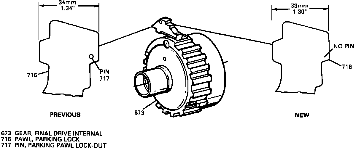 - The parking pawl lock-out pin has been eliminated from the final drive parking lock pawl and the effective length reduced about 1.0 mm (0.0391 from bullet to parking gear because of the wider actuator "bullet". (Figure 4)