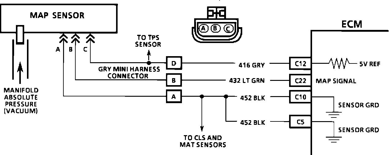 The manifold absolute pressure sensor (MAP) measures manifold pressure (vacuum) and sends that signal to the ECM. The MAP sensor is mainly used for fuel calculation, when the ECM is running in the throttle body backup mode. The MAP sensor is also used to determine the barometric pressure and to help calculate fuel delivery.