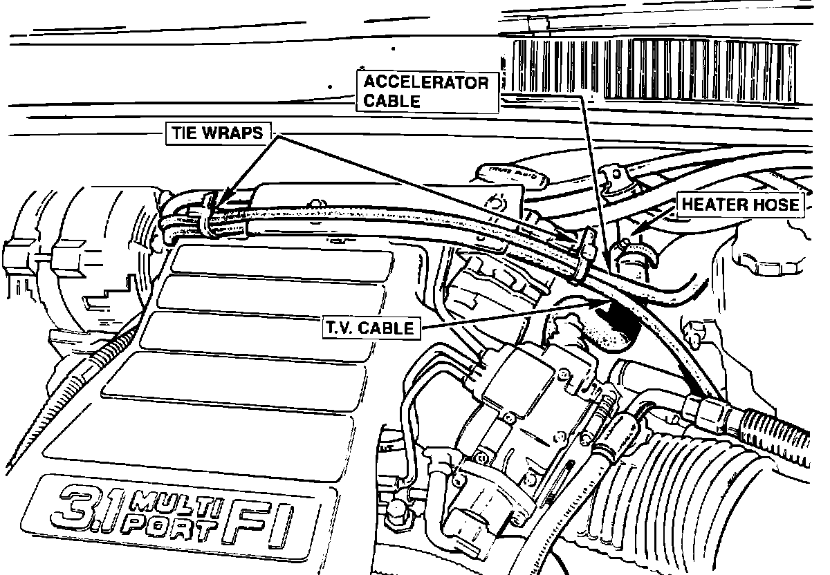 5. Check routing of accelerator and T.V. cables to ensure that there is ample clearance between the cables and the throttle linkage. The accelerator cable must be routed on the outboard side of the heater hose (reference the attached figures) to ensure proper clearance.