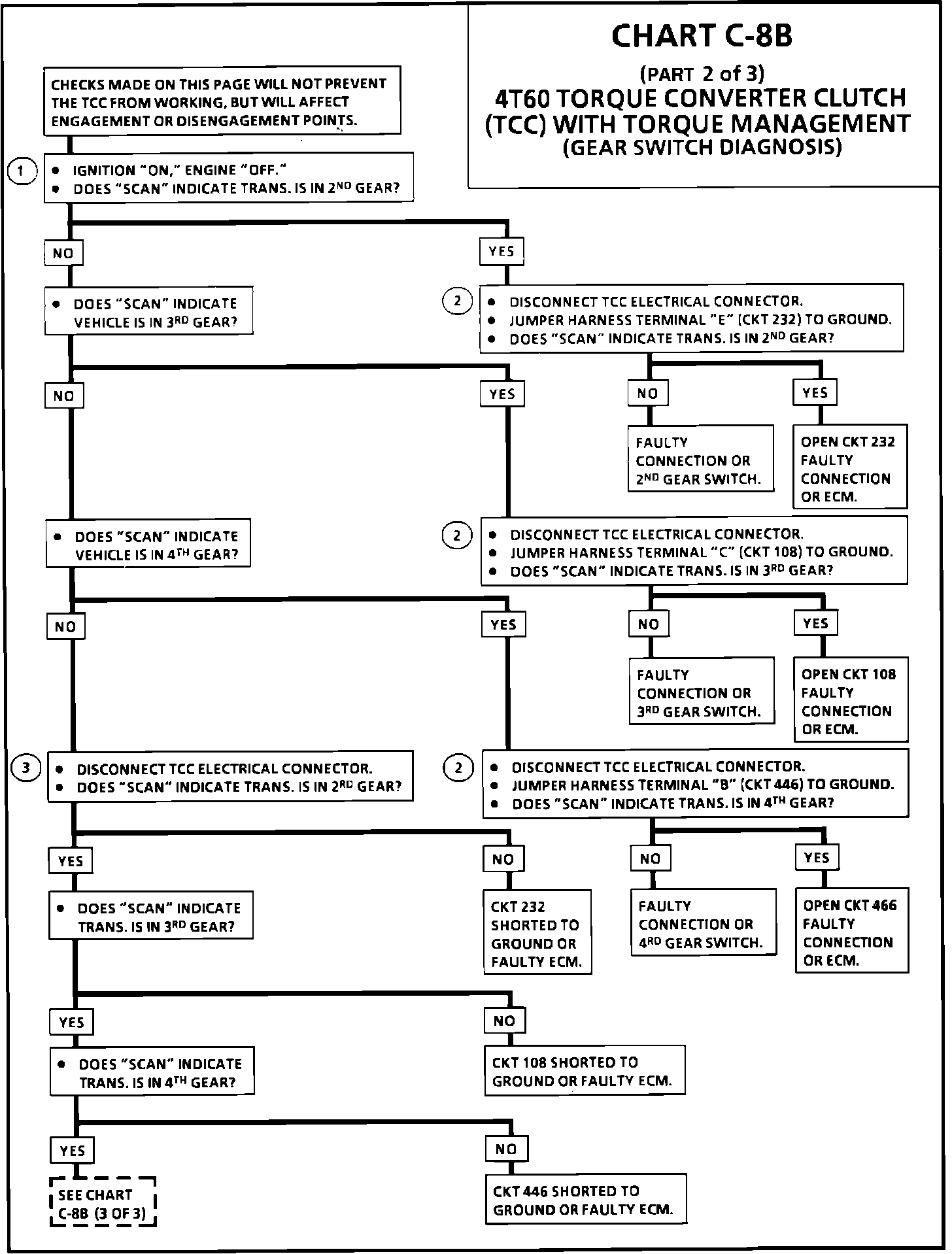 2. Determines whether the switch or signal circuit is open. The circuit can be checked for an open by measuring the voltage (with a voltmeter) at the TCC connector. Should be about 12 volts.