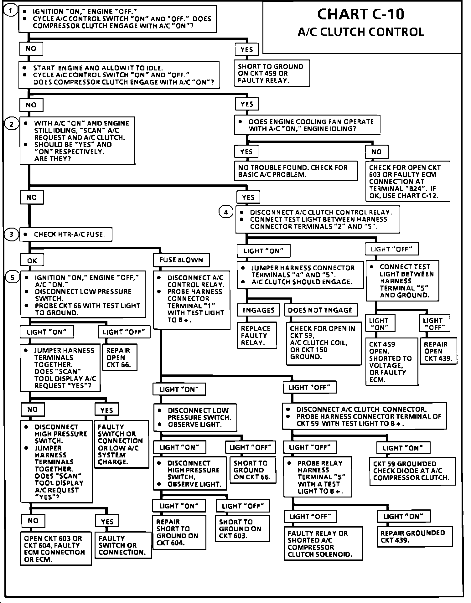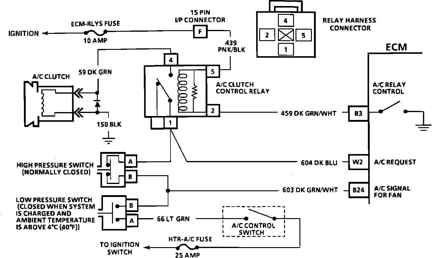When an A/C mode is selected on the A/C control switch, ignition voltage is supplied to the compressor low pressure switch. If there is sufficient system pressure, the low pressure switch will be closed and will complete the circuit to the high pressure cut-off switch and to circuit 604. The voltage on circuit 604 to the ECM is shown on the "Scan" tool as A/C request "YES" (voltage present) or "NO" (no voltage). When a request for A/C is sensed by the ECM, the ECM will ground circuit 459 of the A/C clutch control relay. The relay will then send current to circuits 604 and 59 to engage the A/C compressor clutch. A "Scan" tool will display circuit 459 grounding by showing A/C clutch "ON." If the ECM sensed voltage from circuit 603, the cooling fan will be energized.