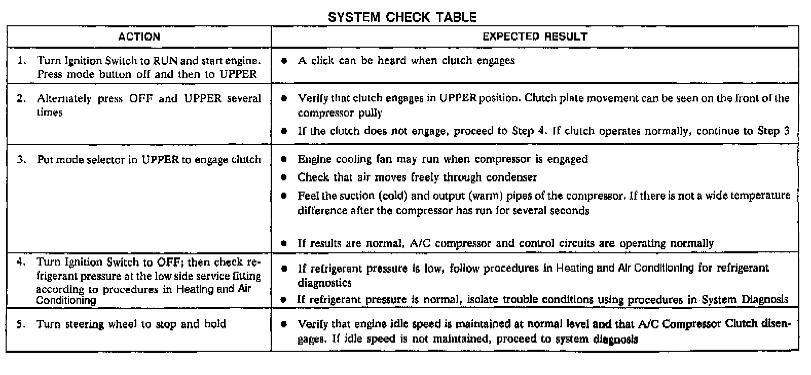 ^ Use the illustrated System Check Table as a guide to normal A/C compressor operation.
