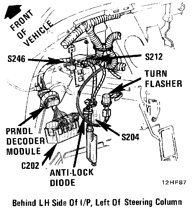 The PRNDL Decoder Module is located behind LH side of Instrument Panel, taped to composite harness left of steering column.