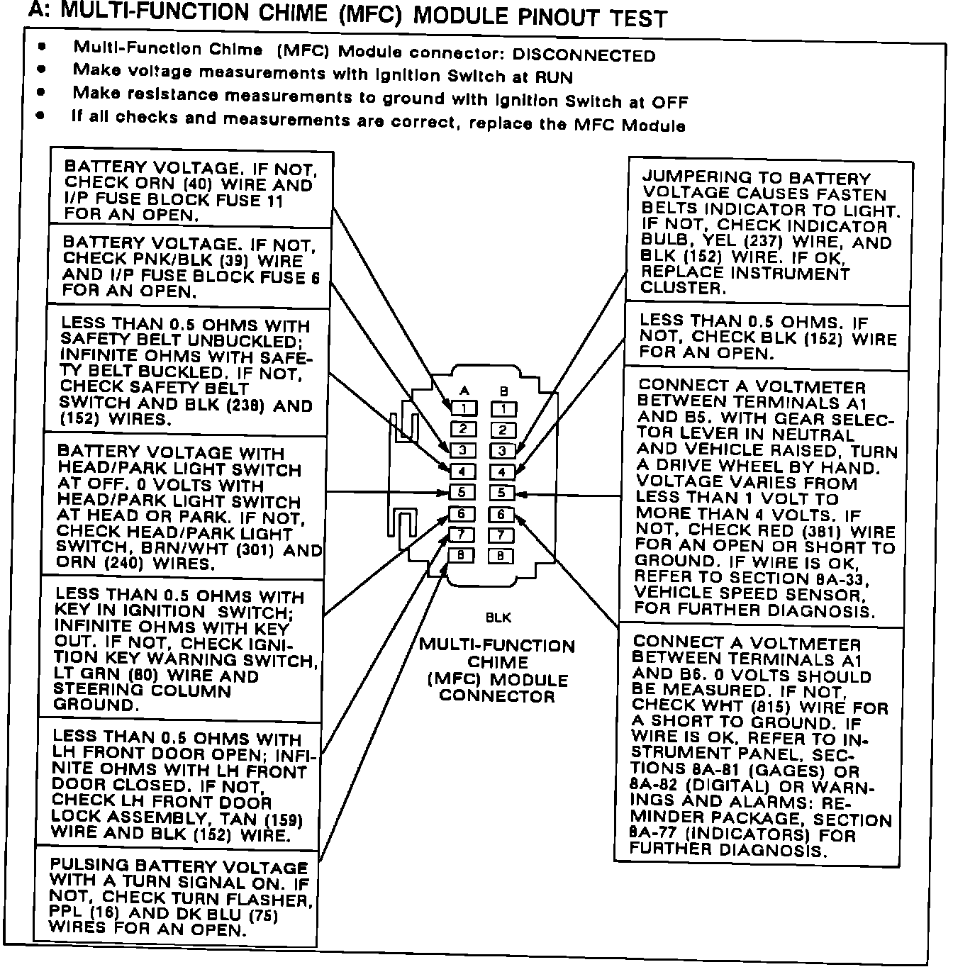 The A: MULTI-FUNCTION CHIME (MFC) MODULE PINOUT TEST CHART on this bulletin must be used for correct diagnosis.