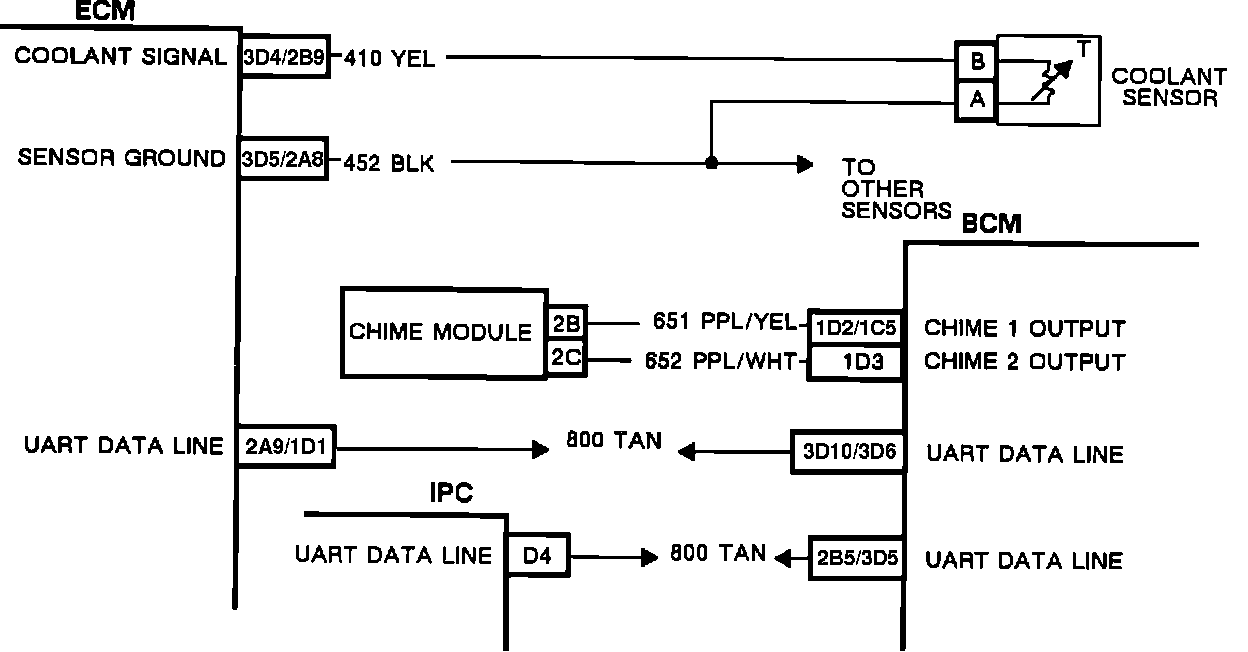 The ECM/PCM provides 5.0 volts to the coolant temperature sensor circuit. The ECM/PCM supplies and internally monitors the voltage level of the circuit at pin C10/2B9. The coolant temperature sensor is a thermistor, so as the coolant temperature goes from cold to hot, the sensor's resistance goes from high to low, and the voltage level the ECM/PCM detects at pin C10/2B9 goes from high to low. Every 1.0 second the BCM checks the ECM/PCM for the coolant temperature. If the failure conditions for the flashing coolant gauge exist for more than 240.0 seconds, or the calculated coolant temperature reaches 135°C and/or all other failure conditions have been met, the IPC will cause the coolant temperature gauge bars to flash. The BCM will send the "HOT STOP ENGINE" message to the IPC and will activate the fast paced chime on the chime module.