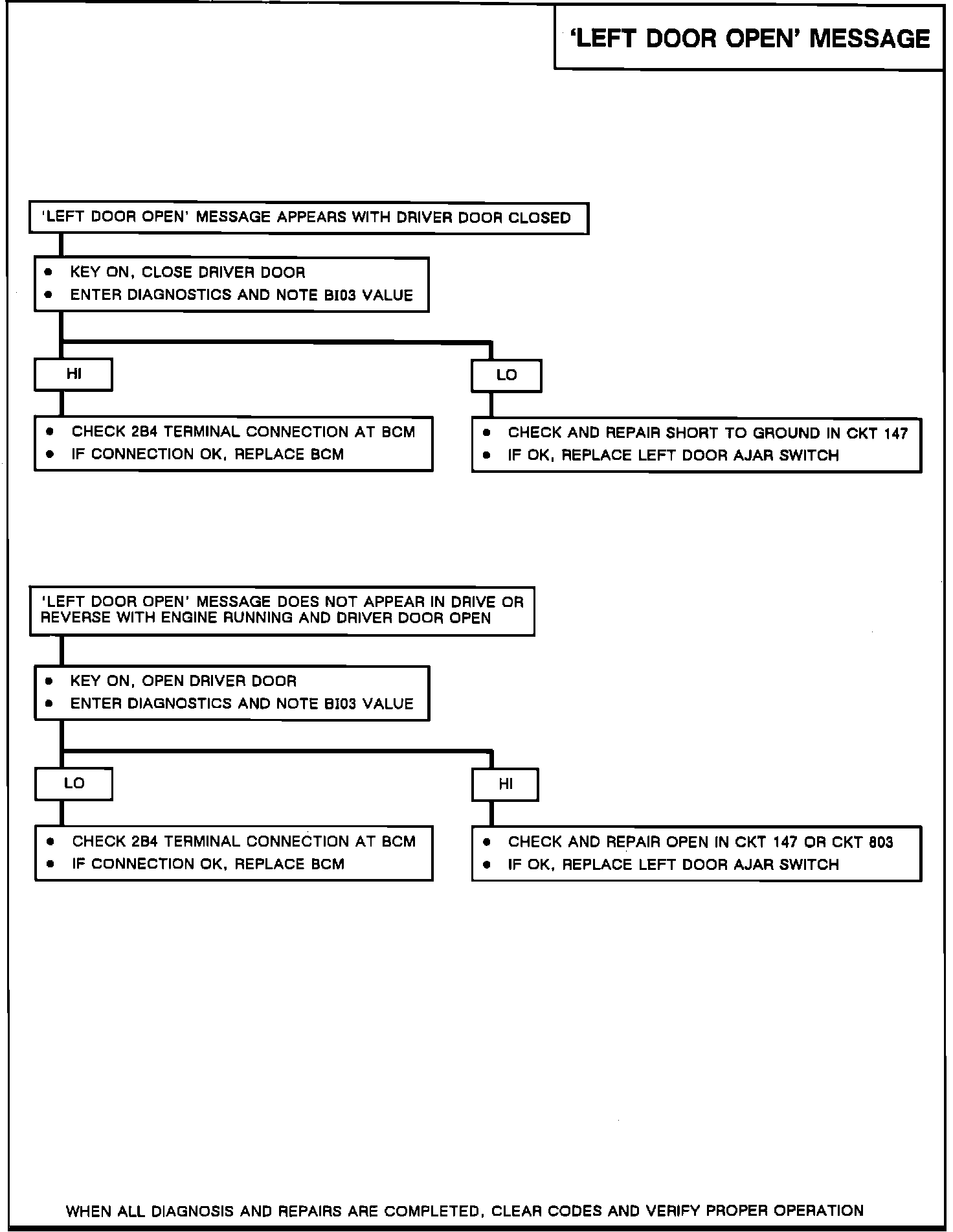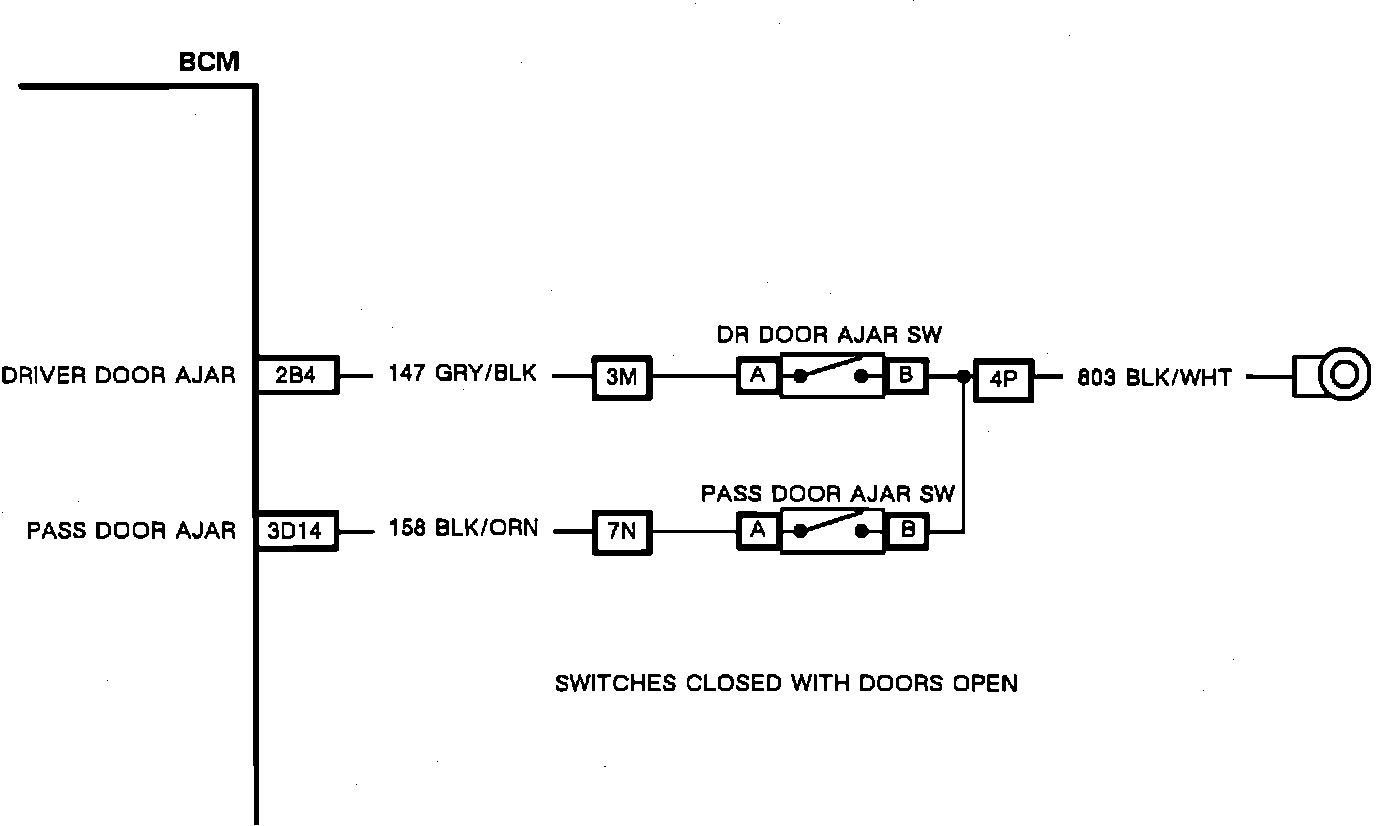 The BCM provides system voltage to the left door ajar circuit, and the left door ajar switch provides the single path to ground. The BCM supplies and internally monitors the voltage level of the circuit at pin 2B4. When the left door ajar circuit is open the BCM will detect system voltage, but if the left door ajar switch provides a path to ground (left door open), the BCM will detect the circuit has been grounded. Once the BCM has determined that all of the failure conditions have been met, it will send the "LEFT DOOR AJAR" message to the IPC. The BCM will also activate the slow paced chime on the chime module.