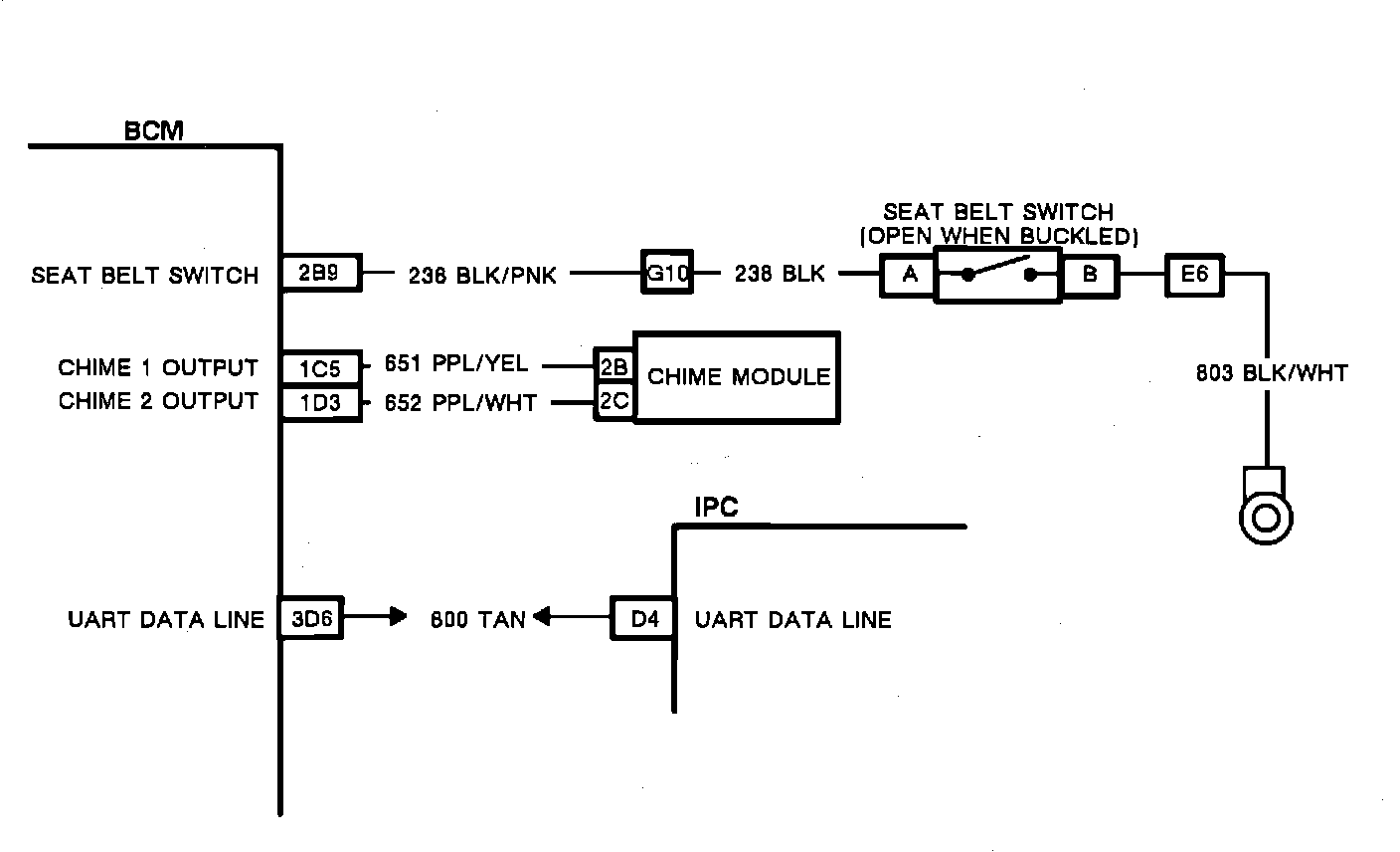 The BCM provides system voltage to the seat belt circuit, and the seat belt switch provides the single path to ground. The BCM supplies and internally monitors the seat belt circuit at pin 2B9. When the seat belt circuit is open the BCM will detect system voltage, but if the seat belt switch provides a path to ground (seat belt unbuckled), the BCM will detect low voltage. Once the BCM has determined that all of the failure conditions have been met, it will turn "ON" the slow paced chime on the chime module and the "SEAT BELT" indicator light on the IPC. If the seat belt switch opens prior to the 6.0 second time-out, the chime will stop but the indicator will remain lit for the duration of the time-out period.