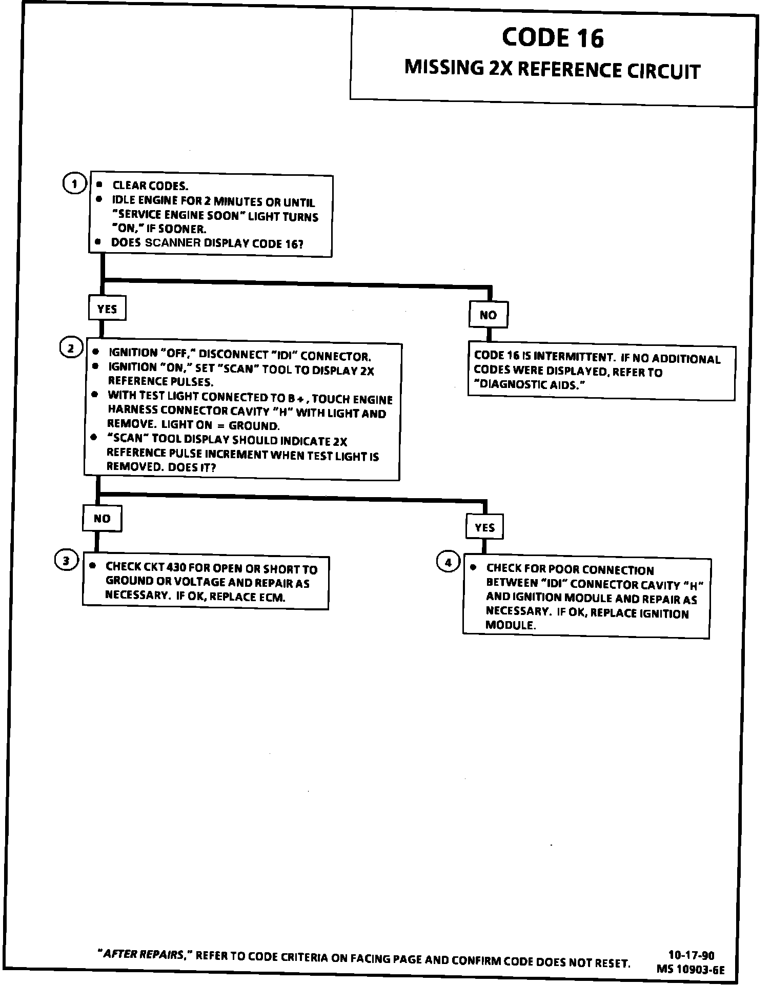 4. Step 2 indicated that CKT 430 is OK and the ECM is capable of recognizing the simulated 2X reference pulse. This indicates either a poor connection at ignition module terminal "H" or a faulty ignition module caused the Code 16.
