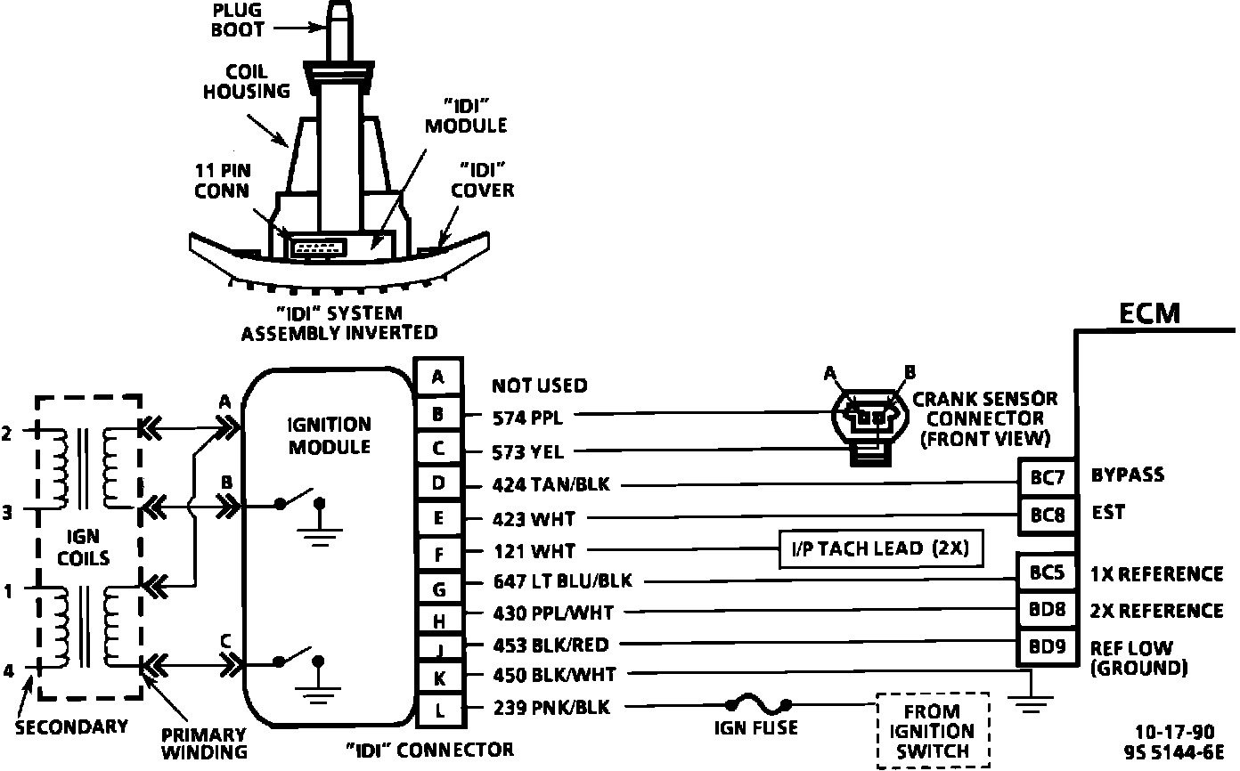 The ignition module sends a reference signal to the ECM twice per revolution to indicate crankshaft position and rpm so that the ECM can determine when to pulse the ignition coils and control ignition timing. This signal is called the 2X reference because it occurs two times per revolution. The ignition module applies 5 volts from terminal "H" through CKT 430 to ECM terminal "BD8" and in effect, switches this circuit to ground for a very short period of time. Code 16 is set if the ECM receives 1X reference pulses with no 2X reference pulses.