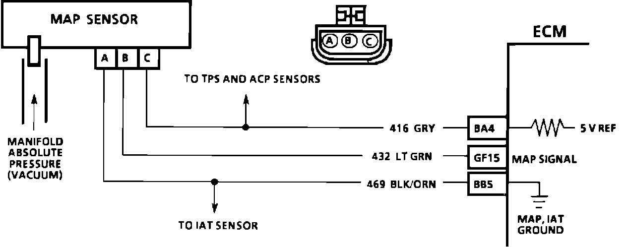If the MAP sensor fails, the ECM will substitute a fixed MAP value and use the Throttle Position Sensor (TPS) to control fuel delivery.