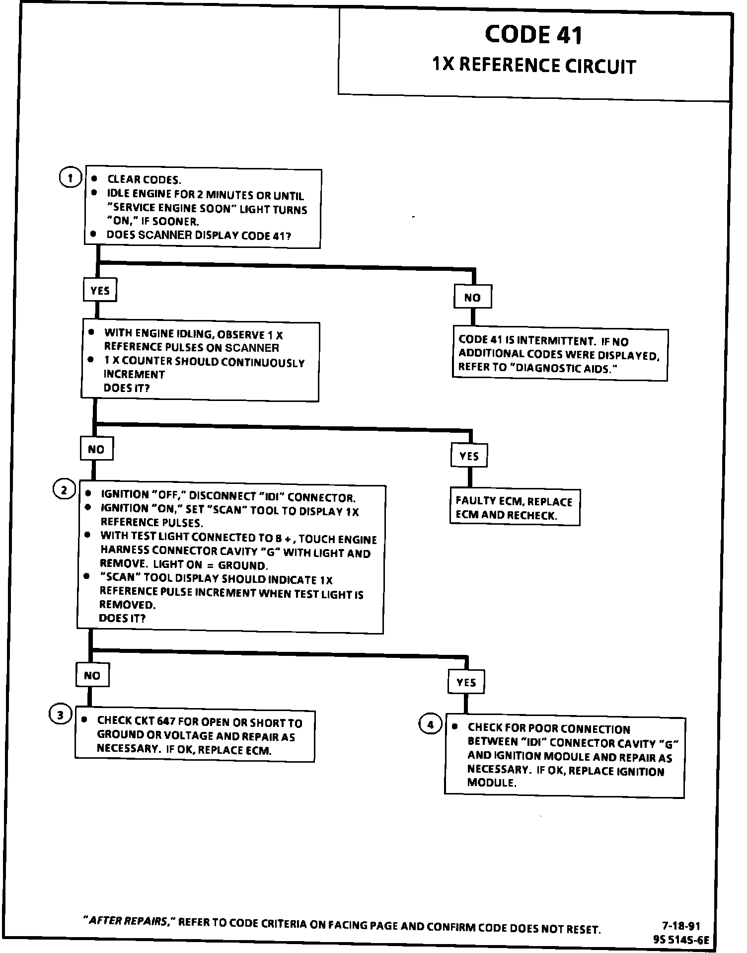 4. Step 2 indicated that circuit 647 is OK and the ECM is capable of recognizing the simulated 1X reference pulse. This indicates either a poor connection at ignition module terminal "G" or a faulty ignition module caused the Code 41.
