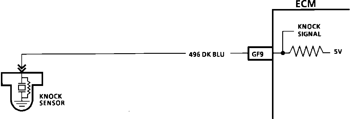 The knock sensor detects engine detonation and the ECM retards the electronic spark timing based on the signal being received. Under a no knock condition, the circuitry within the knock sensor causes the ECM 5 volts to be pulled down so that CKT 496 would measure about 2.5 volts. The knock sensor produces an AC signal which rides on the 2.5 volts DC voltage. The amplitude and signal frequency are dependent upon the knock level.