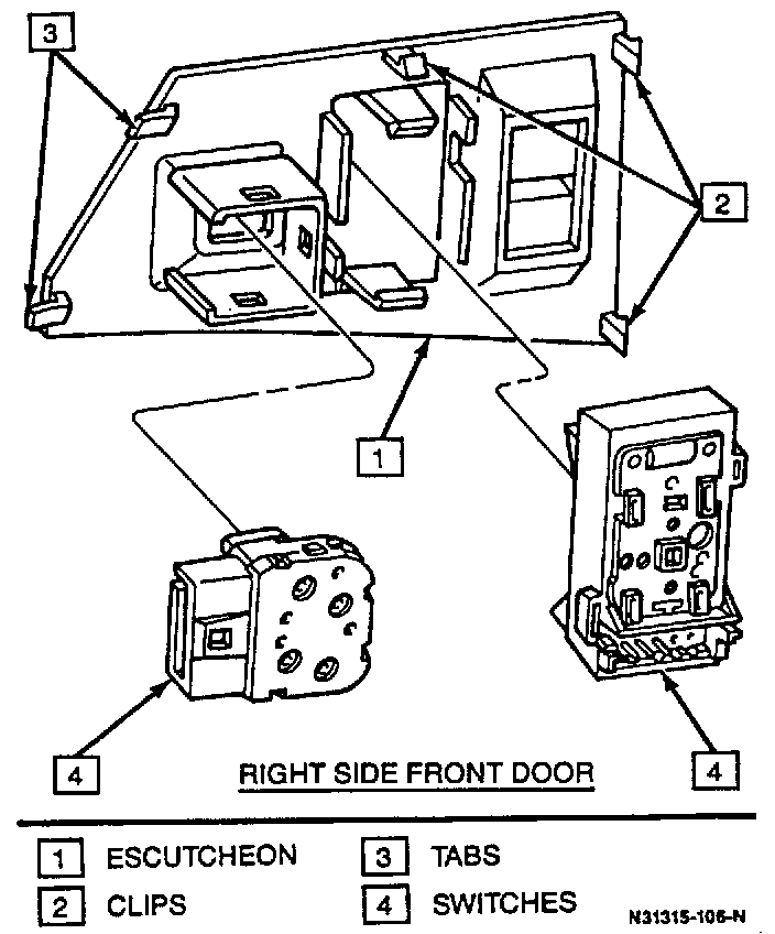 1. With a thin bladed tool, disengage clips (2) and slide escutcheon (1) forward to disengage tabs (3).