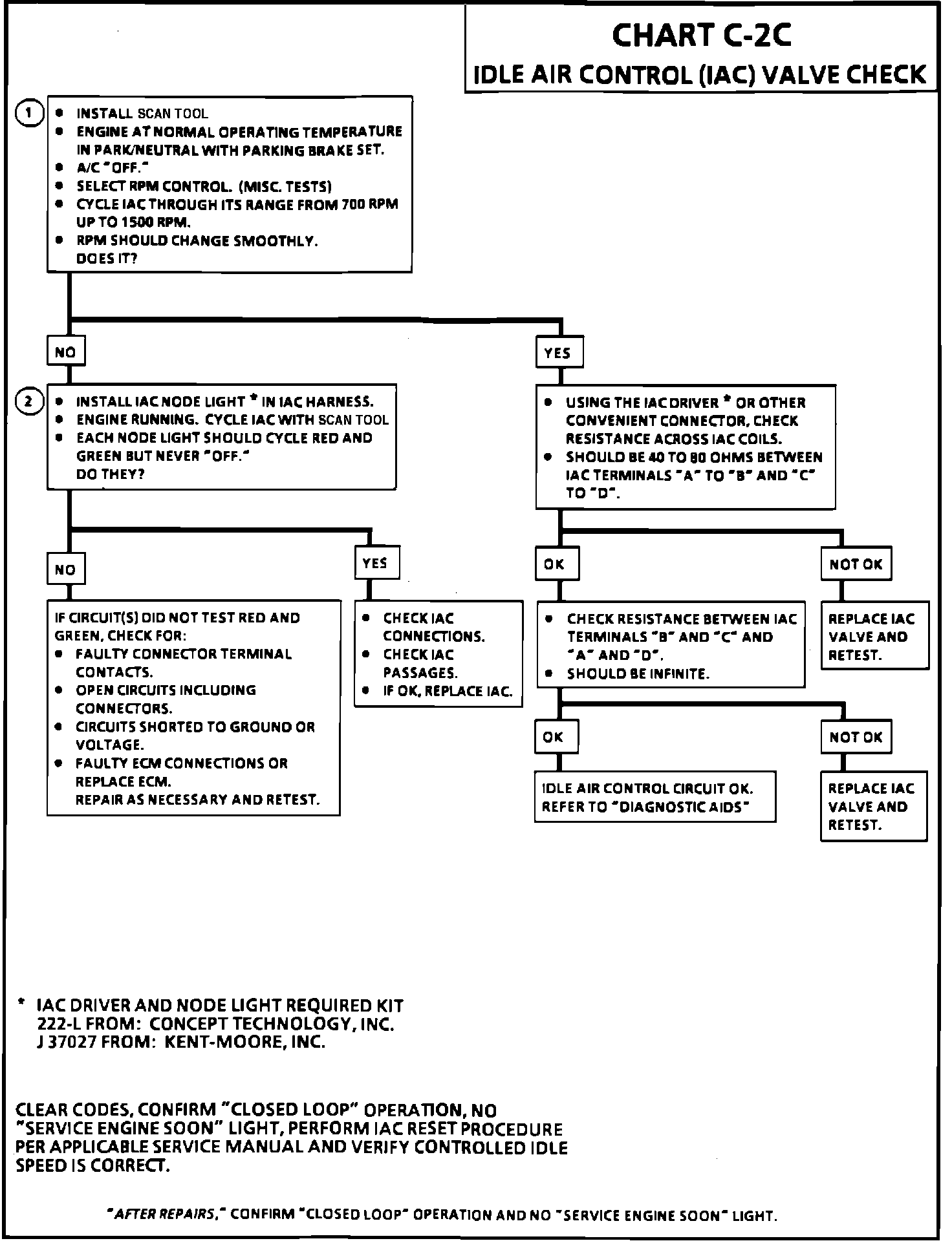 Step 1 verified proper IAC valve operation while this step checks IAC circuits. Each lamp on the node lights should flash red and green while the IAC valve is cycled. While the sequence of color is not important if either light is "OFF" or does not flash red and green, check the circuits for faults begining with poor terminal contacts.