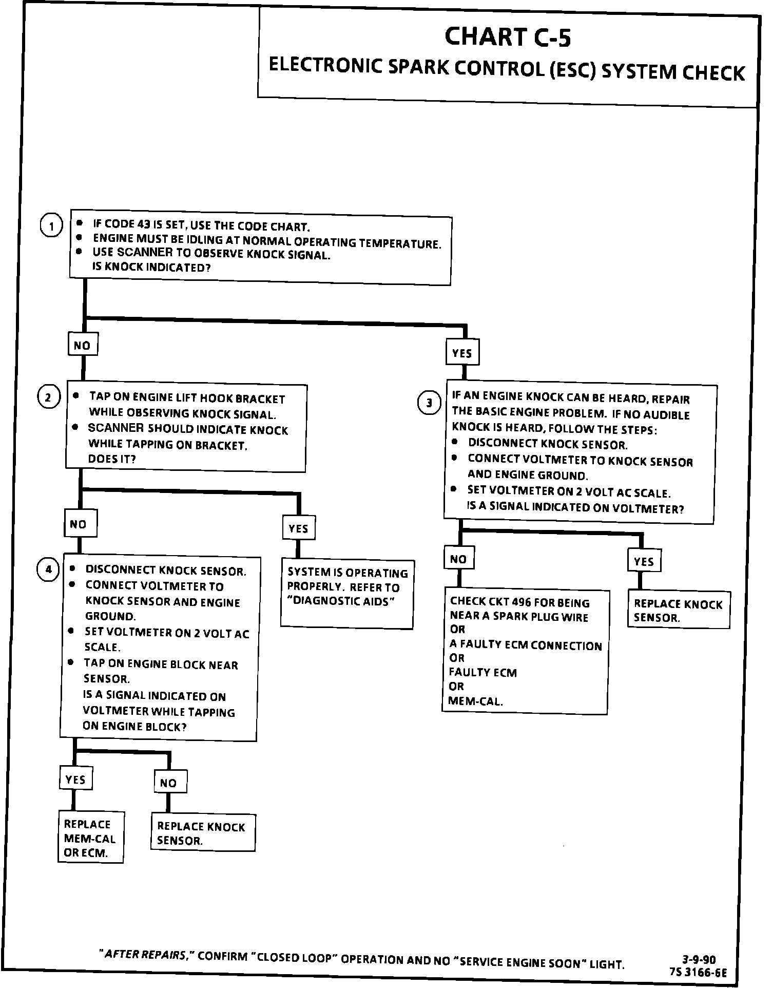 4. This test determines if the knock sensor is faulty or if the ESC portion of the Mem-Cal is faulty. If it is determined that the Mem-Cal is faulty, be sure that is properly installed and latched into place. If not properly installed, repair and retest.
