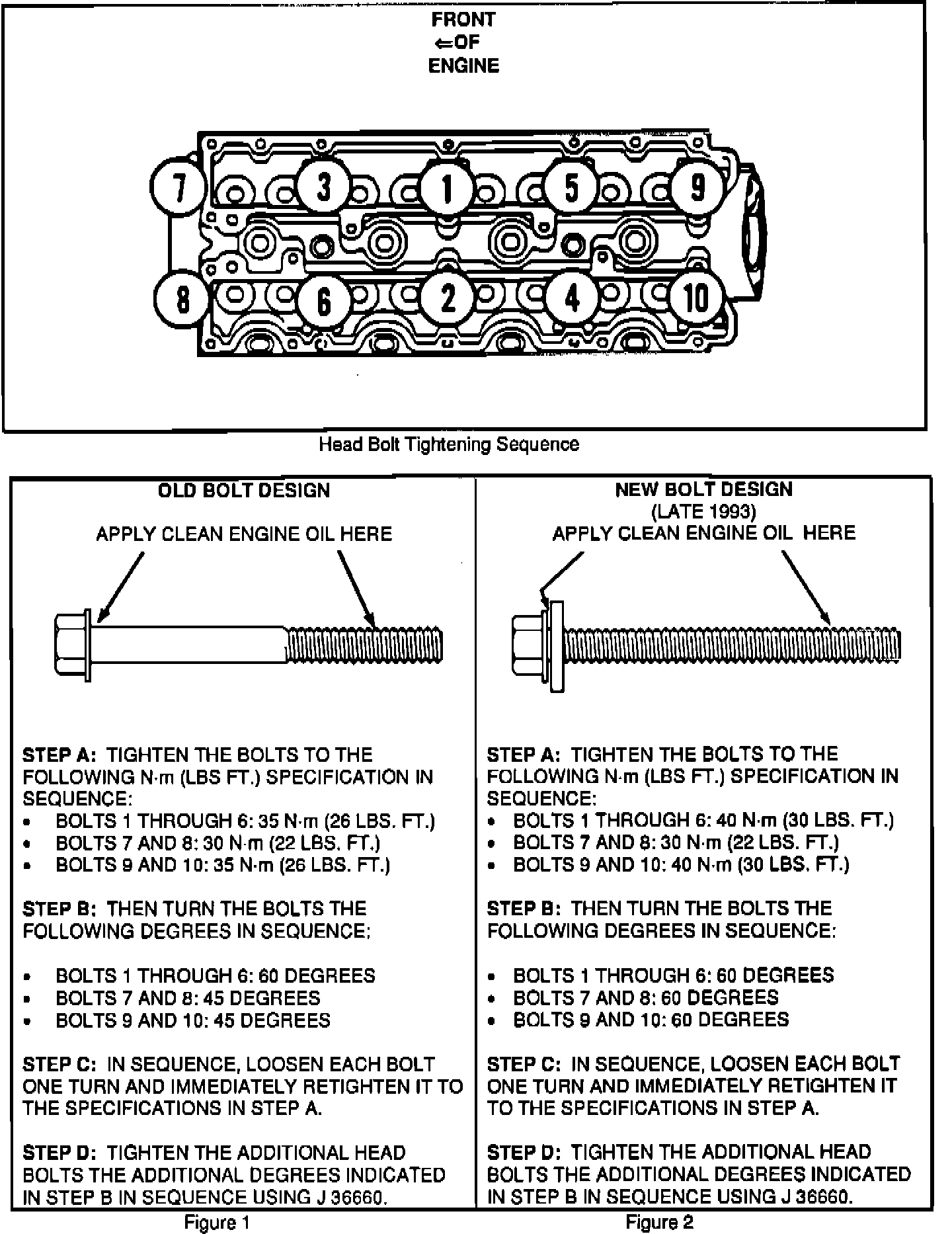 D. After completing Step C on all ten bolts, in SEQUENCE tighten the cylinder head bolts the additional degrees indicated in Figures 1 and 2 (Figure 1 for old bolt design and Figure 2 for new bolt design) using J 36660.