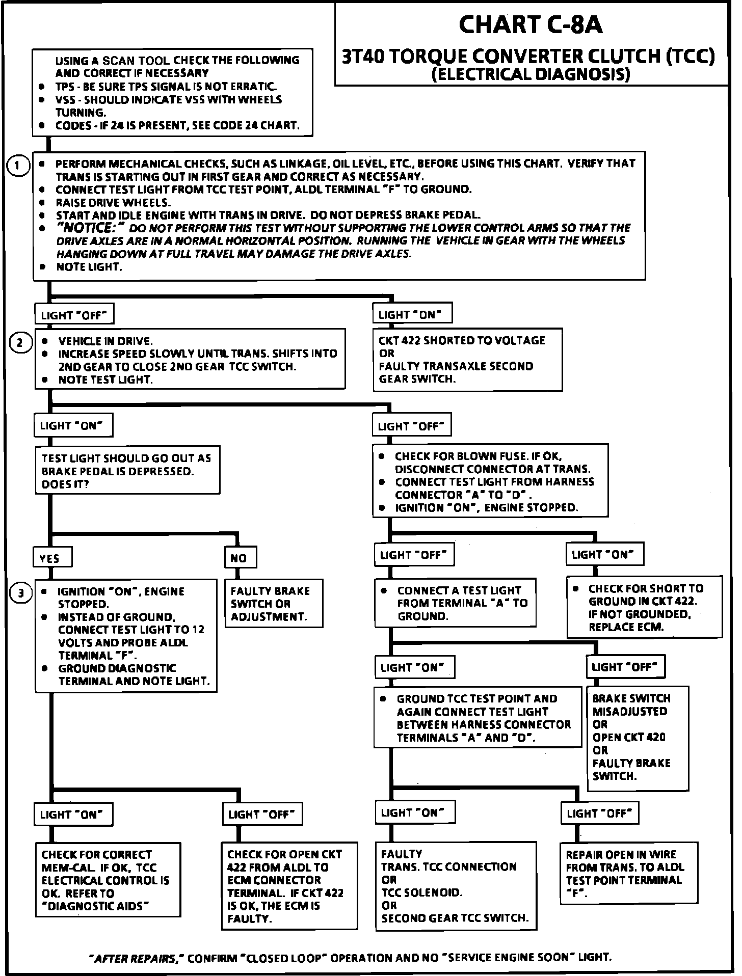 Fused battery ignition is supplied to the TCC solenoid through the brake switch, and transmission second gear apply switch. The ECM will engage TCC by grounding CKT 422 to energize the solenoid.