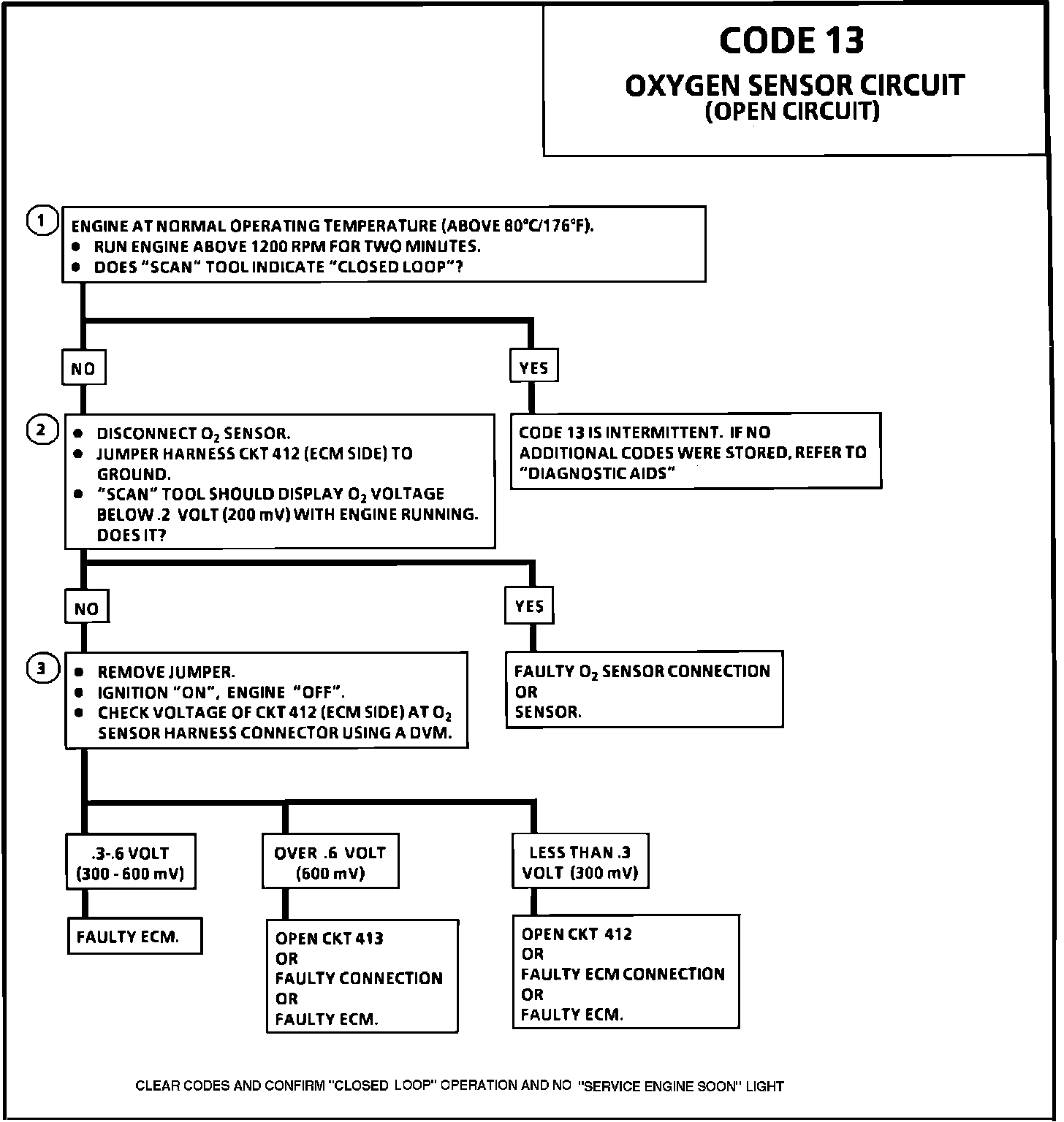 ^ Normal "Scan" voltage varies between 100 mV to 999 mV (0.1 volt to 1.0 volt) while in "Closed Loop". Code 13 sets in 30 seconds if voltage remains between 0.35 volt and 0.55 volt, but the system will go "Open Loop" in about 15 seconds. - Intermittent Malfunctions