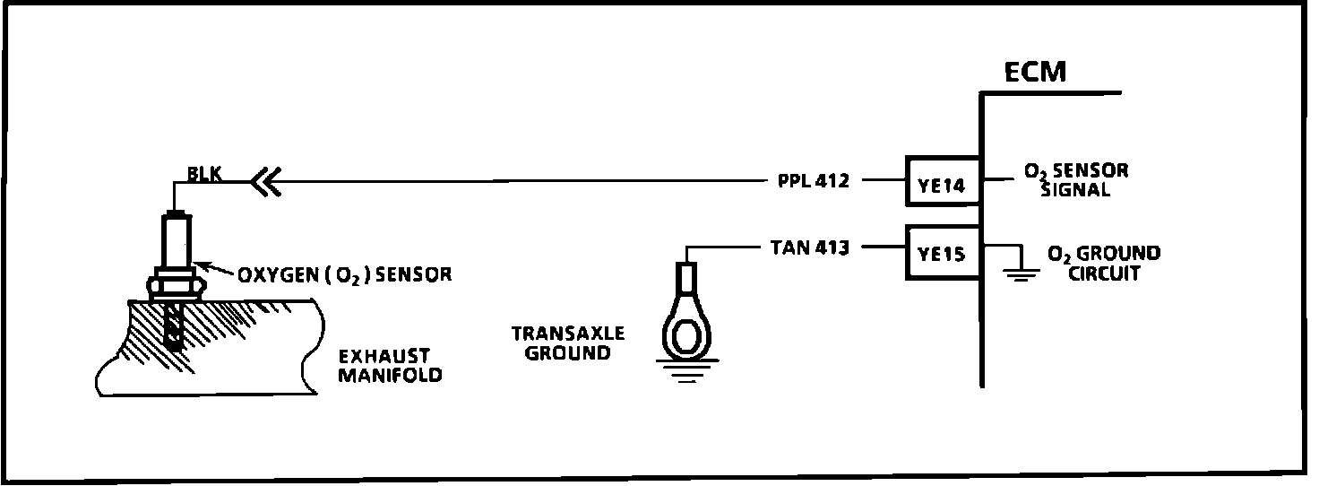 The ECM supplies a voltage of about 0.45 volt between terminals "YE14" and "YE15". (If measured with a 10 megohm digital voltmeter, this may read as low as 0.32 volt.) The 02 sensor varies the voltage within a range of about 1 volt if the exhaust is rich, down through about 0.10 volt if exhaust is lean.