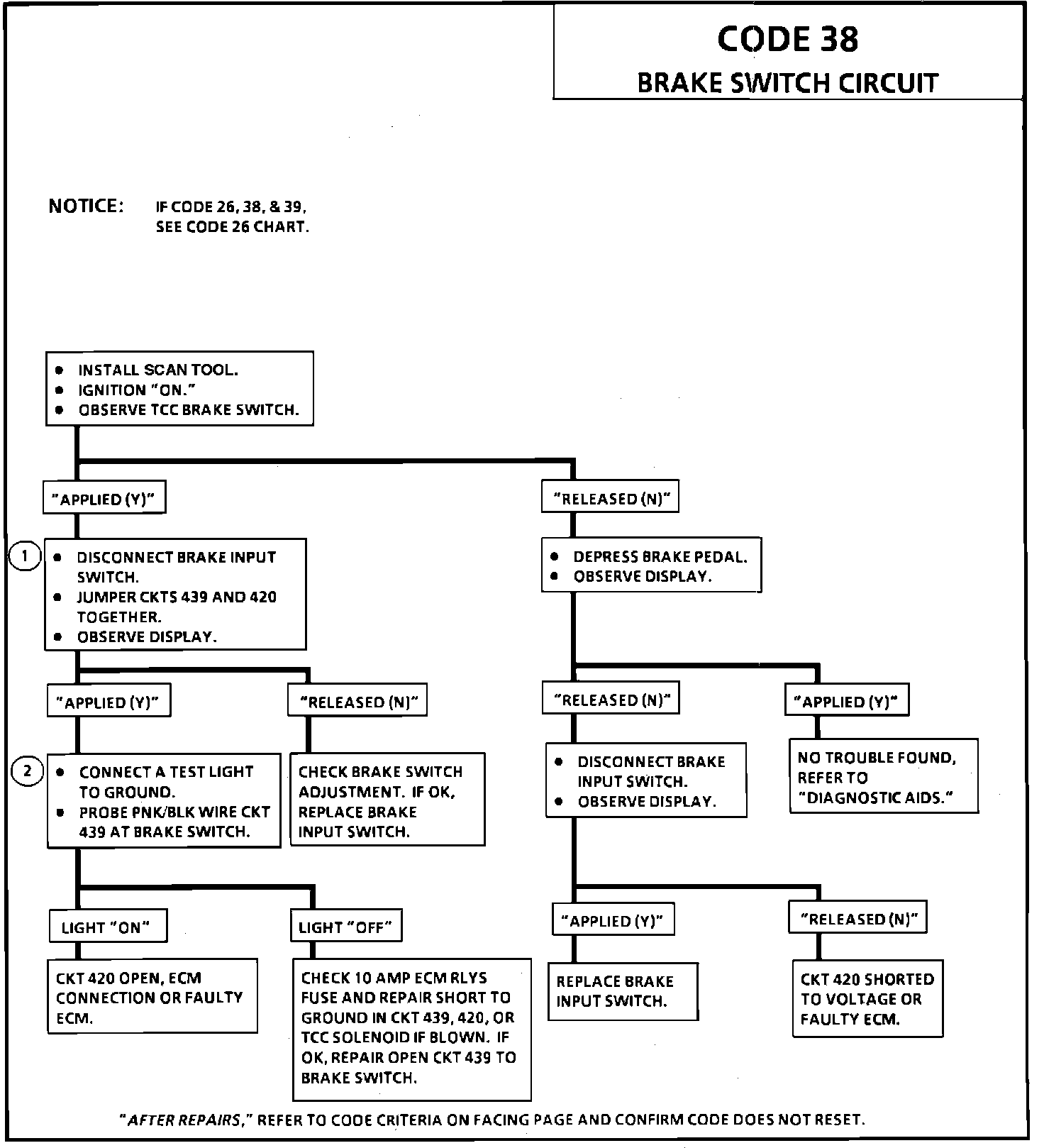 ^ A Code 38 in combination with a Code 39 would mean a problem with one or more of the following components. Fuse, CKT 439, brake switch or wire before the splice.