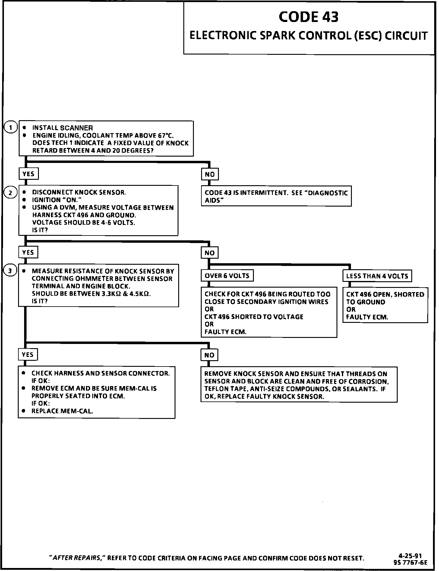 The knock sensor is used to detect engine detonation and the ECM will retard the electronic spark timing based on the signal being received. The circuitry within the knock sensor causes the ECM's supplied 5 volt signal to be pulled down, so that under a no knock condition CKT 496 would measure about 2.5 volts. The knock sensor produces an A/C signal which rides on the 2.5 volts DC voltage. The amplitude and signal frequency is dependent upon the knock level. If CKT 496 becomes open or shorted to ground, the voltage will either go above 3.5 volts or below 1.5 volts. If either of these conditions are met for 20 seconds, a Code 43 will be stored.