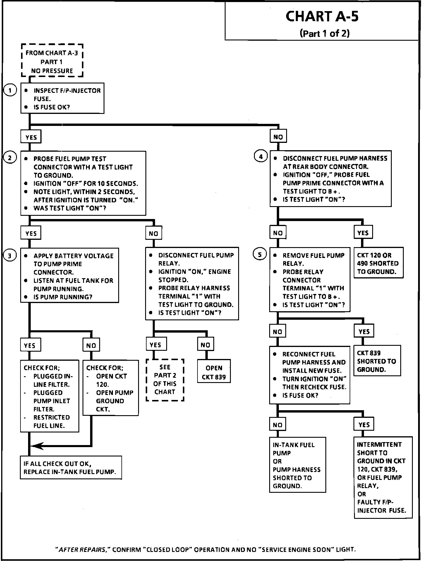 5. Checks for a short to ground in the fuel pump relay harness CKT 839.