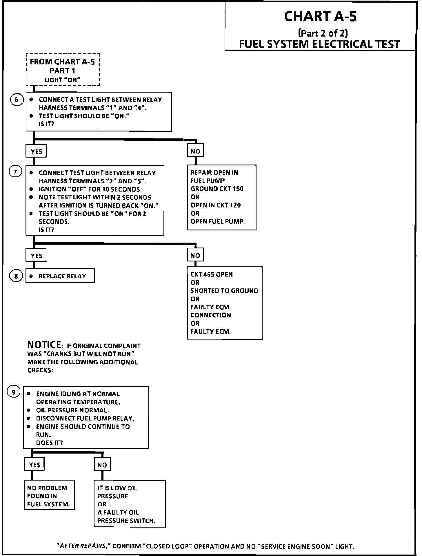 9. This step checks the oil pressure switch to be sure it provides battery feed to the fuel pump should the pump relay fail. A failed pump relay will result in extended engine crank time because of the time required to build enough oil pressure to close the oil pressure switch and turn "ON" the fuel pump. There may be instances when the relay has failed but the engine will not crank fast enough to build enough oil pressure to close the switch. This or a faulty oil pressure switch can result in "Engine Cranks But Won't Run."
