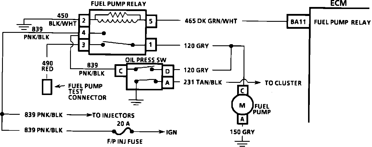 7. Determines if the ECM is in control of the fuel pump relay through CKT 465, (terminal "5").
