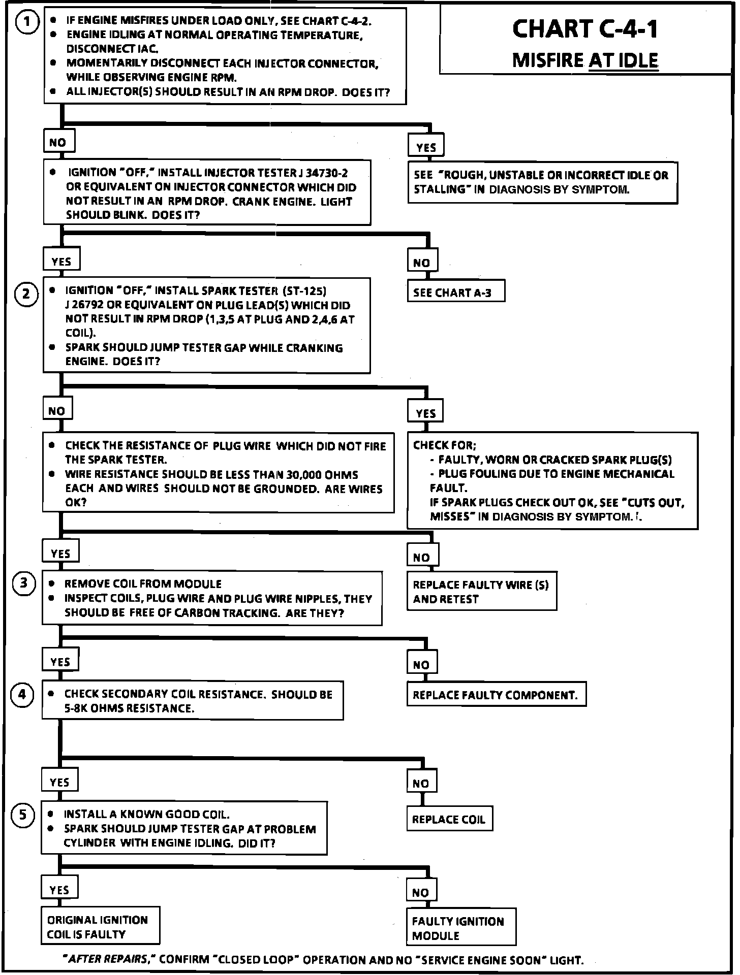 1. If the "misfire" complaint exists under load only, the diagnostic CHART C-4-2 must be used. Engine rpm should drop approximately equally on all cylinders.