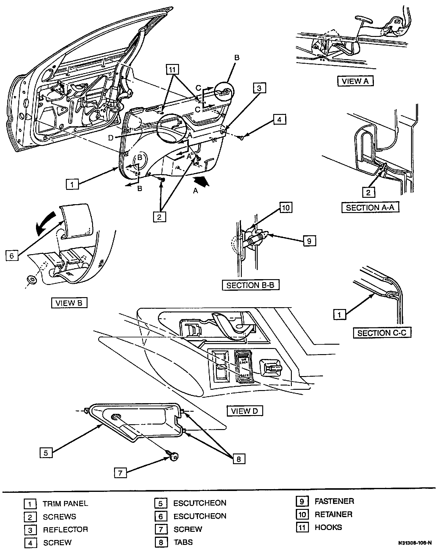 11. Door trim panel (1) by lifting at bottom of panel to disengage hooks (11) from slots on inner door panel.
