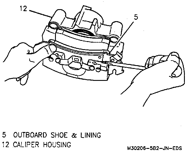 2. Remove outboard shoe and lining.Use screwdriver to disengage buttons on shoe from holes in caliper housing.