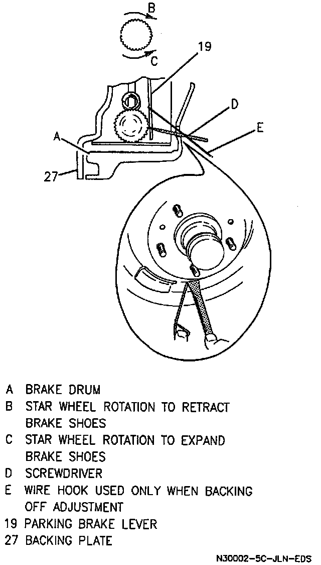 NOTE: Brakes should be free of drag when adjuster has been backed off approximately 12 notches. Heavy drag at this point indicates tight parking brake cables.