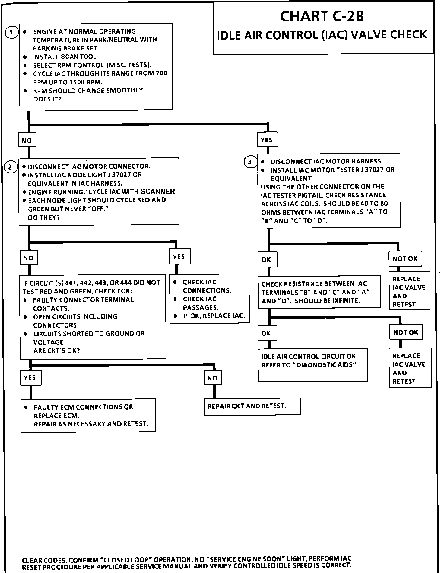 ^ If for some reason the air intake to the engine is restricted, the ECM will attempt to compensate, by backing out the IAC valve to maintain idle speed. This may result in IAC counts above 60. If the engine has another source of air into the intake, the ECM will compensate by extending the IAC valve. The IAC counts may be zero as the ECM tries to maintain idle speed. If idle speed is to high IAC "Scan" counts will be zero.