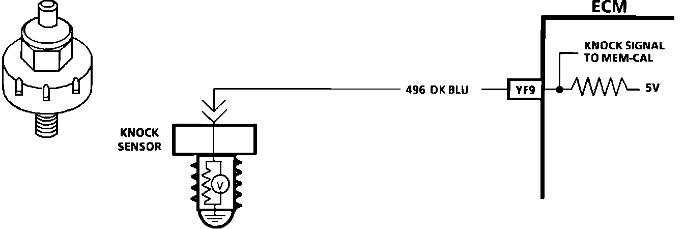 The knock sensor is used to detect engine detonation and the ECM will retard the electronic spark timing based on the signal being received, The circuitry within the knock sensor causes the ECM's supplied 5 volt signal to be pulled down so that under a no knock condition, CKT 496 would measure about 2.5 volts.