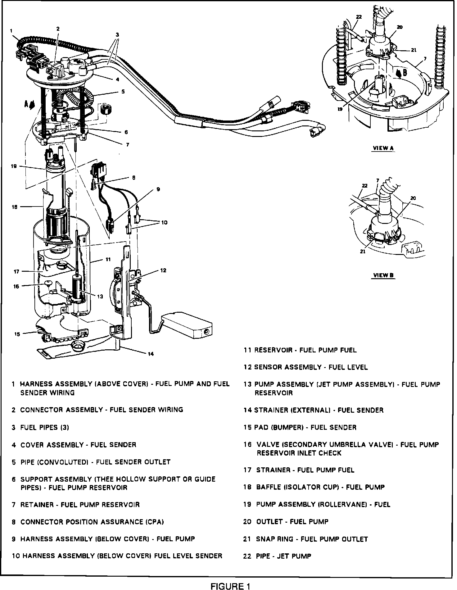 9. Install fuel pump outlet retainer # 21 on fuel pump outlet # 20. Index the snap ring so that the ends are positioned in the groove # 22 facing the fuel pump electrical connection. (View A and B)