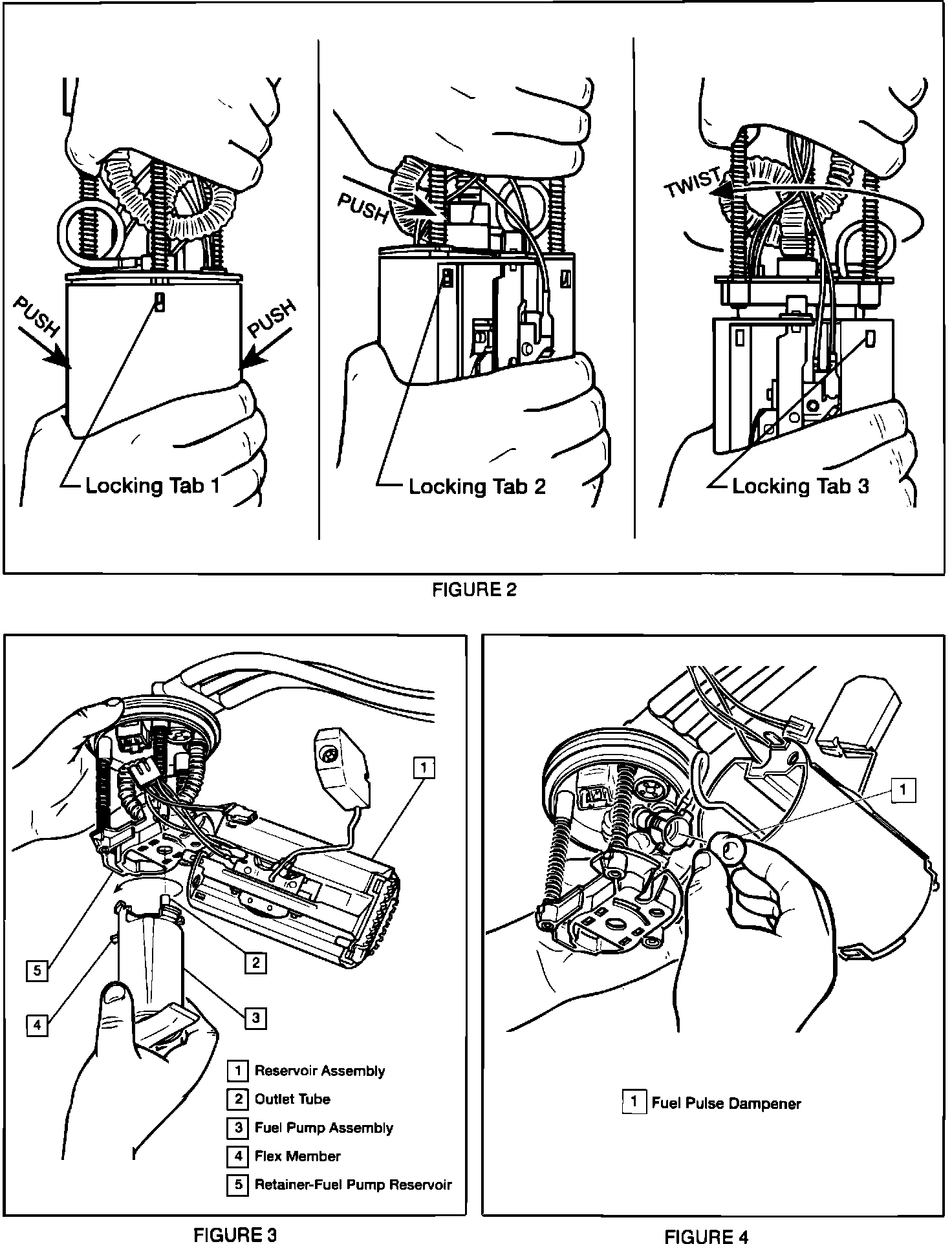 Gently pull on fuel pump reservoir from retainer to assure a secure fastening. If not secure replace entire fuel sender.