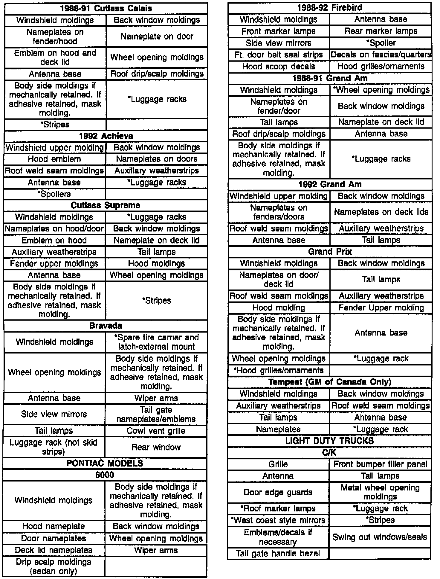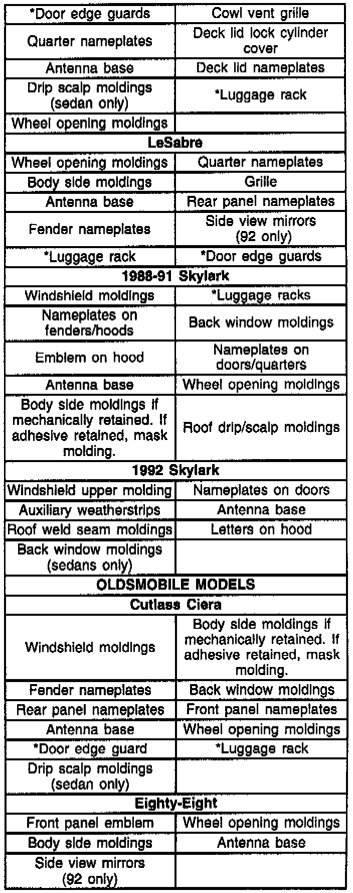 Important:Some technicians may apply a small cord (wire, plastic tube, etc.) behind or underneath moldings that remain on the vehicle to improve sanding and painting. If the vehicle paint system is baked with cord in place, damage to some moldings may occur. If this technique is used, DO NOT BAKE PAINT, air dry only.