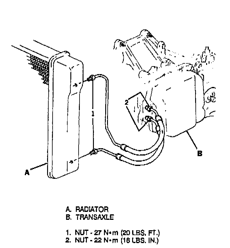^ Transaxle cooler and lines should be flushed with J 35944 or equivalent whenever the transaxle has been removed for overhaul or replacement or the torque converter, pump or case.