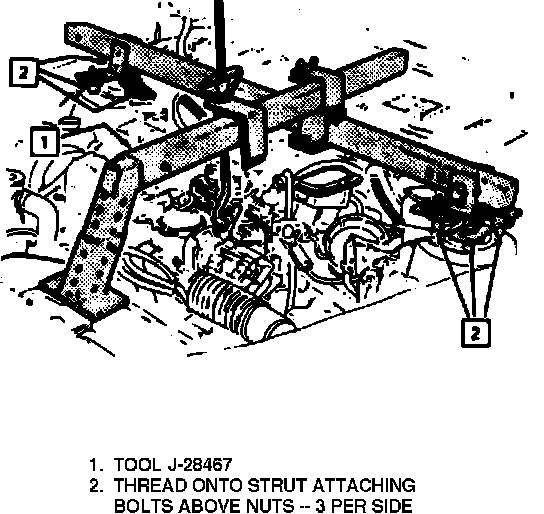 2. Install engine support fixture J-28467-A or equivalent, then raise engine enough to take pressure off motor mounts, Fig. 6.