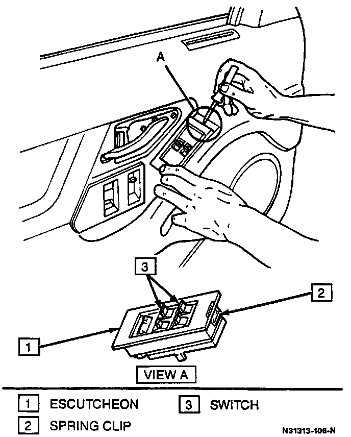 1. Door lock switch escutcheon (1), by disengaging spring clip (2) with a thin bladed screwdriver an( removing from trim panel.
