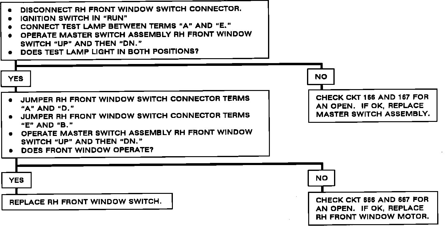 Chart #5 - RH Front Window Does Not Operate From RH Front Window Switch Or From Master Switch: